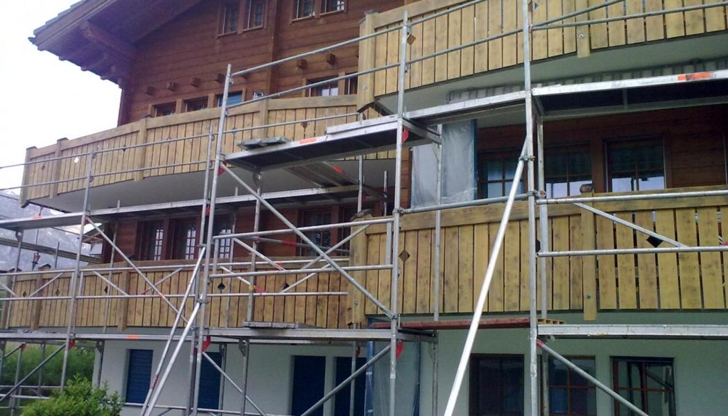 Unser eigenes Fassadengerüst erlaubt uns eine unabhängige und damit termingerechte Ausführung verschiedener Arbeiten an Fassaden und Innenräumen.